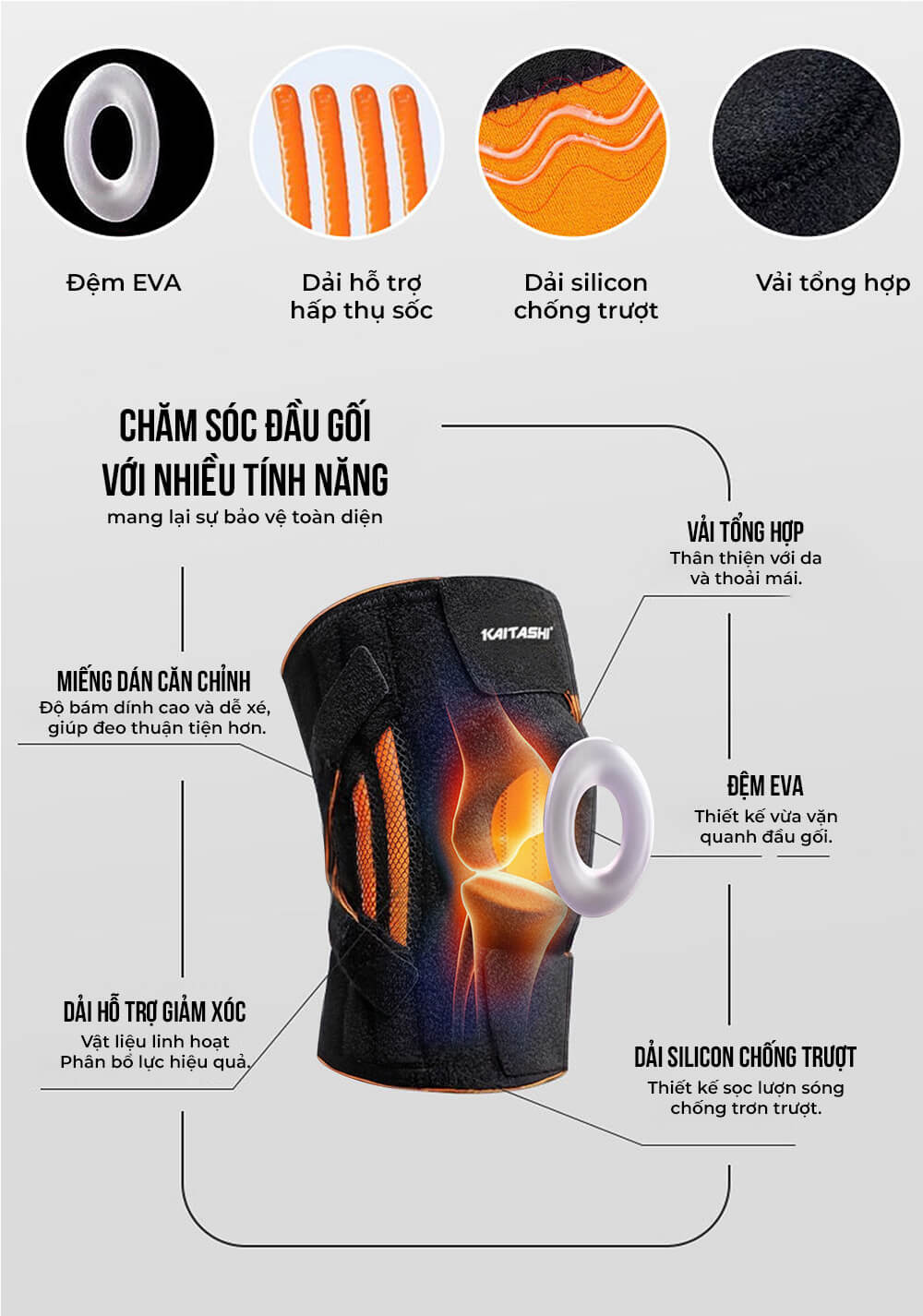 - Giảm đau nhức và hỗ trợ phục hồi sau chấn thương: Với khả năng phân tán áp lực và nâng đỡ, đai gối Kaitashi KSG009 giúp giảm cảm giác đau nhức khi vận động, đồng thời hỗ trợ quá trình hồi phục ở người từng bị chấn thương đầu gối hoặc người cao tuổi có khớp gối yếu.