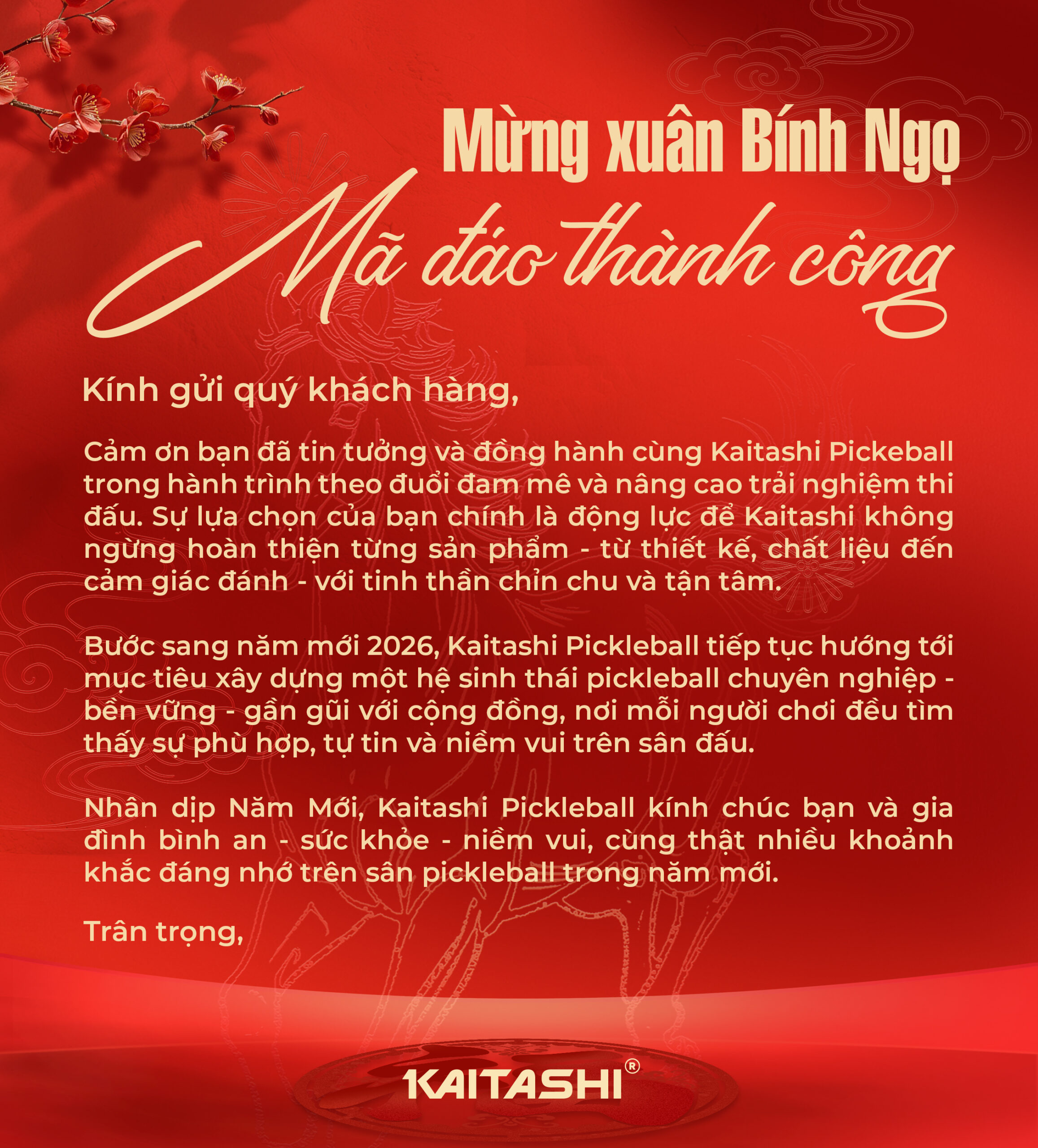 Bước sang năm Bính Ngọ, Kaitashi Pickleball xin gửi lời tri ân chân thành đến cộng đồng người chơi đã luôn tin tưởng và đồng hành trong suốt thời gian qua. Chính niềm đam mê, tinh thần thể thao và sự gắn bó của bạn là động lực để Kaitashi không ngừng cải tiến sản phẩm, nâng cao trải nghiệm và lan tỏa giá trị pickleball bền vững.