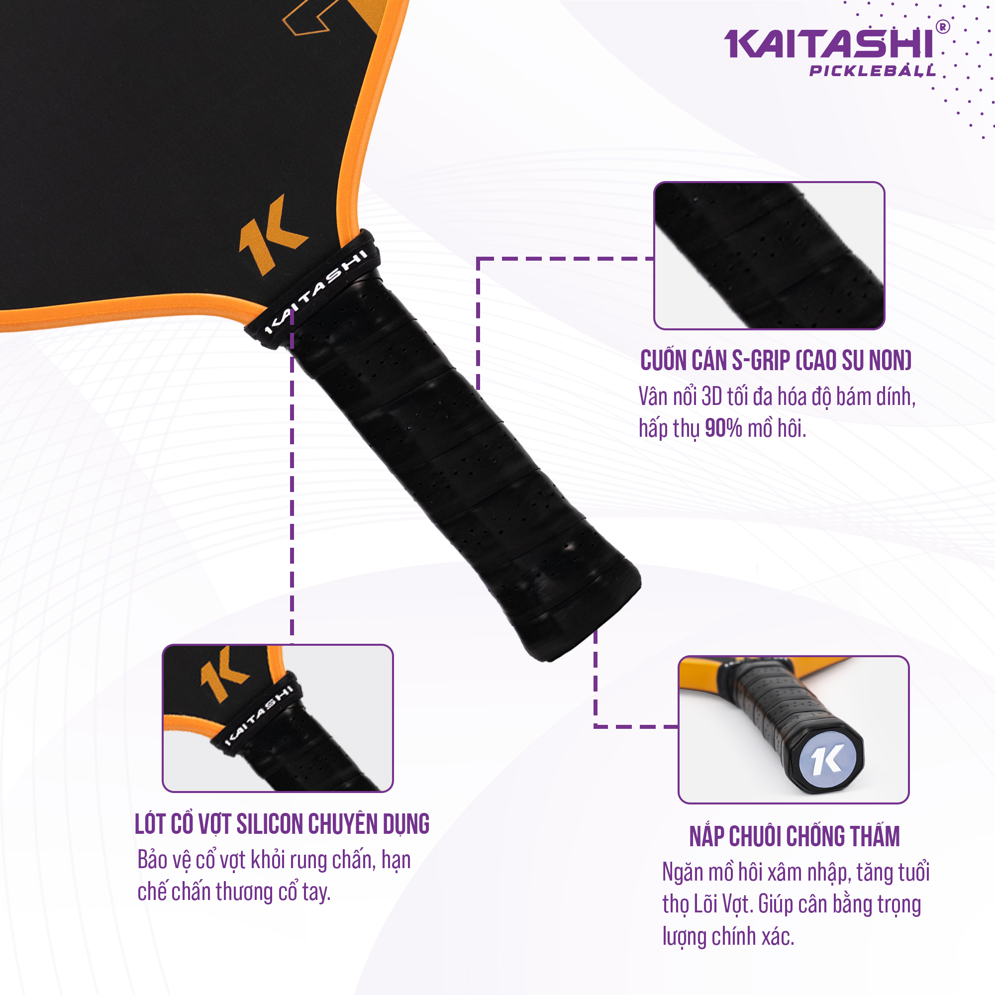 Tay cầm Kaitashi Kai Power Pro được thiết kế tỉ mỉ với lớp bọt xốp epoxy đàn hồi cao kết hợp da PU mềm mịn, mang lại cảm giác êm ái, chắc tay và chống trơn trượt hiệu quả ngay cả khi chơi trong thời gian dài. Cấu trúc tay cầm tối ưu giúp phân bổ lực đồng đều, giảm áp lực lên cổ tay và tăng độ ổn định cho từng cú đánh, mang đến trải nghiệm cầm nắm thoải mái và tự tin trên mọi sân đấu.