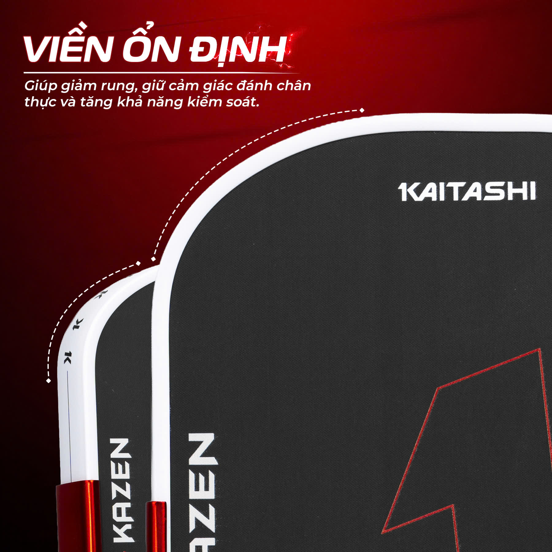 Logo chữ “K” cách điệu lớn nằm chính giữa mặt vợt không chỉ là nhận diện thương hiệu, mà còn là tuyên ngôn về chất lượng. Với slogan “Speed / Power Balance” (Cân bằng Tốc độ / Sức mạnh), Kaitashi Project Kazen được sinh ra để phục vụ những tay vợt toàn diện – những người muốn có những cú smash uy lực cuối sân nhưng vẫn giữ được sự tinh tế, mềm mại trong những pha dink (bỏ nhỏ) hay block (chặn bóng) trên lưới.